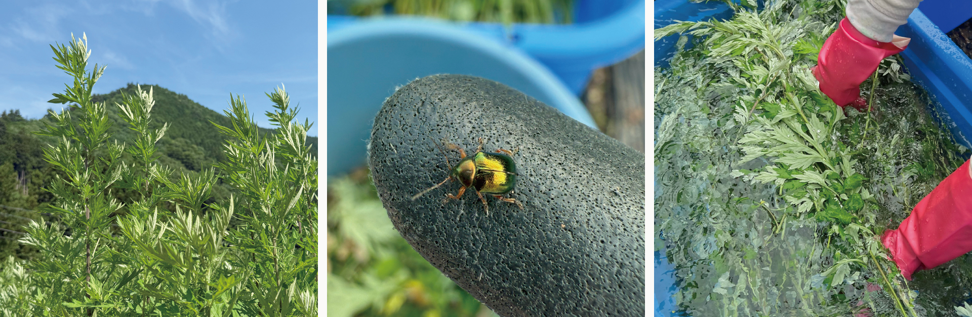 「名水百選 第1号・宗祇水」に象徴される郡上の清らかな水で、よもぎを丁寧に洗浄。草の息づかいを損なわずに整えます。