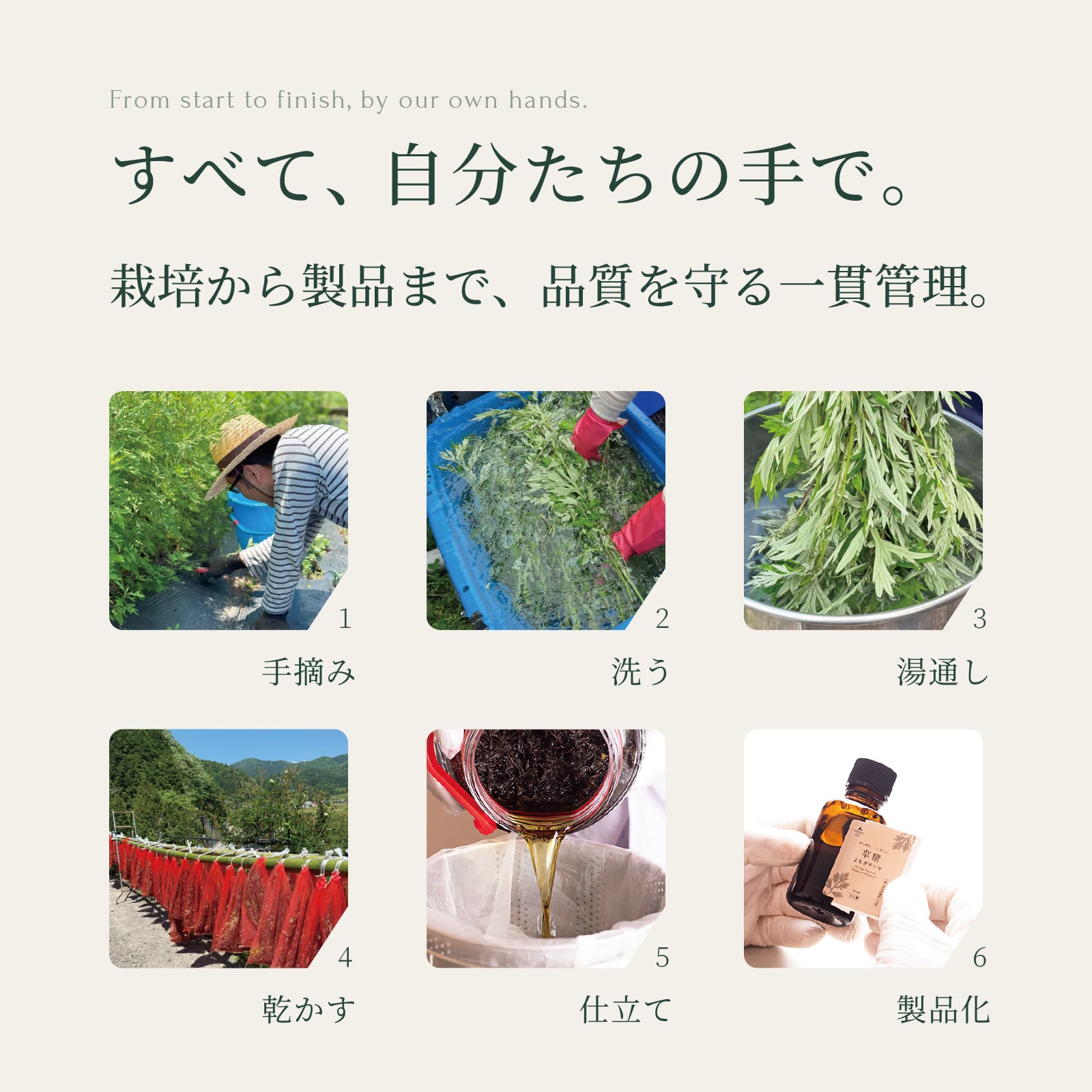 栽培から採取、洗浄、湯通し、刻み、仕立て、商品化まで。
